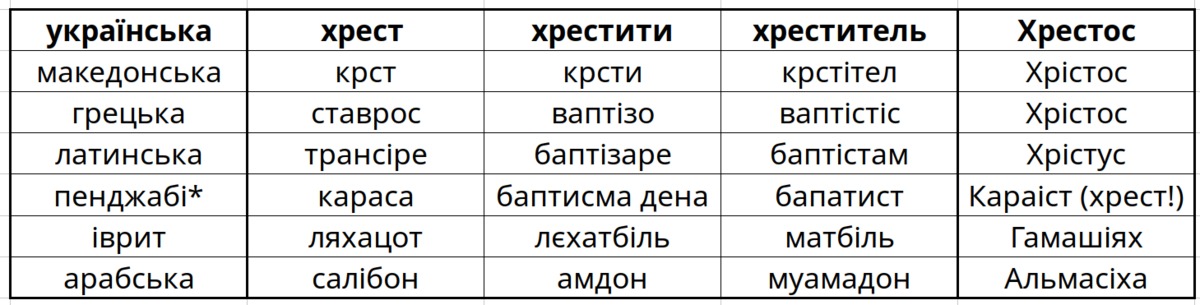 Бачимо, що звичне слово Христос походить від праукраїнського слова Хреститель. Воно було змінене грецькою вимовою — Хрестос (пізніше затерте в старих книгах на Хрістос — Χριστός). А позаяк, тодішня Русь ще знала правду, то й кажемо не грецьке перезапозичення з праукраїнської Хріст(ос), а Хрест(ос), бо це українське слово, лише з грецьким закінченням "-ос". Або таке: кажемо не Ісуса Хрестоса, а по старому — Ісуса Хреста (де видно розуміння українського слова «хрест»).