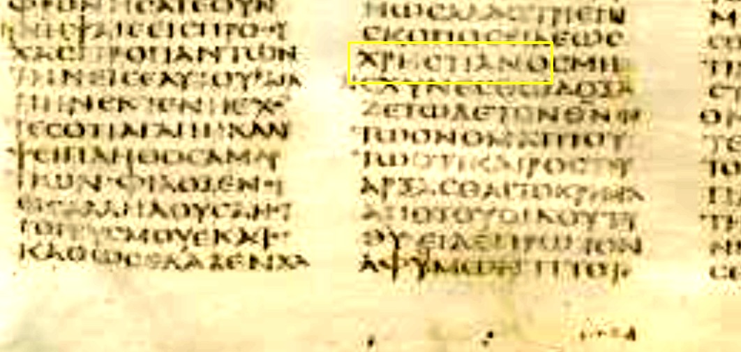 Із Євангелія з Синайського кодексу, Перше послання апостола Петра 4.16: «А коли – як хрестиянин – то хай не соромиться, але хай прославляє Бога в цьому імені». Тут видно, що «хрестиянин» підтерте на «хрістиянин», так само видно і в інших місцях.