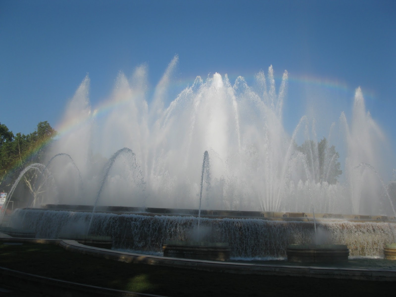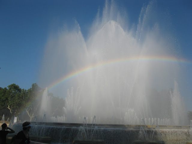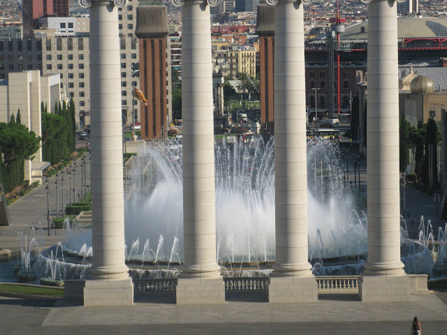 Спускаємось сходами вниз до Магічного фонтану Монжуїка (исп. Fuente mágica de Montjuic, кат. Font màgica de Montjuïc). Він був побудований у 1929 році до Всесвітньої виставки. А перед Олімпіадою-1992, був добавлений музичний супровід. Фонтан працює за таким графіком: