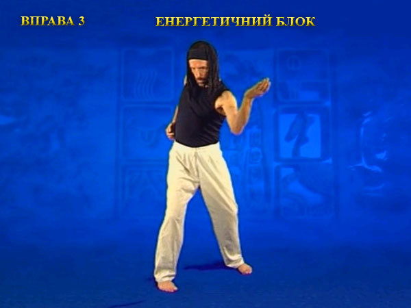 Після закінчення видиху тіло переходить в робочу стійку і відразу розвертається у попереку ліворуч із зігнутою на 90 градусів в лікті лівою рукою (долоня руки дивиться назовні). При цьому права рука знаходиться на рівні пояса навпроти пупка (долоня звернена до тіла всередину). Потім тіло скручується праворуч. При цьому центр ваги зміщується трохи вперед. Ребро долоні лівої руки рухається по дузі, закручуючись всередину. Необхідно створити напругу від кінчиків пальців рук до області селезінки і нирок. Потім виконується розворот вправо.