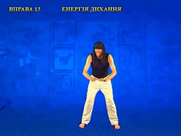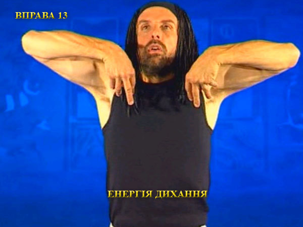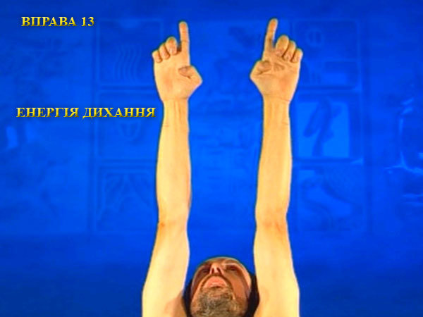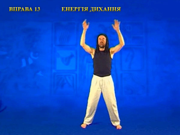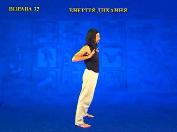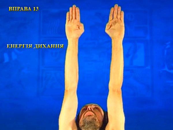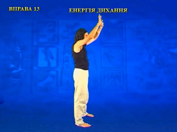 Під час вдиху пальці поверніть до пахв, розтягуючи грудну клітку і ноги. Роблячи видих, опишіть руками коло перед тілом, прагнучи утримати вказівні пальці вертикально вгору. Видих закінчується, коли пальці рук повернуться до пахв.