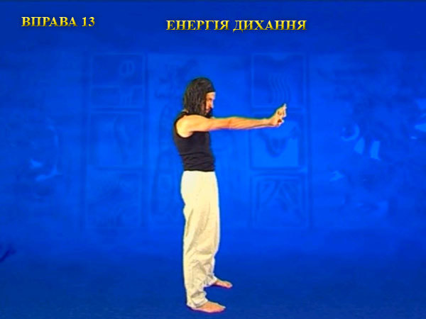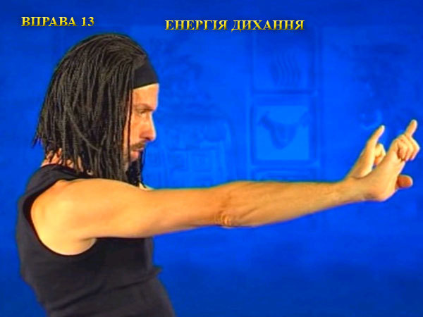 Під час видиху, не міняючи положення пальців, витягайте руки вперед, а центр ваги зміщуйте назад. При цьому вказівні пальці дивляться вгору.