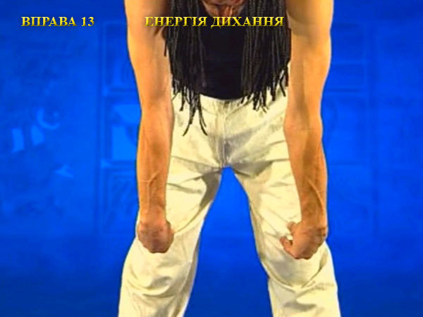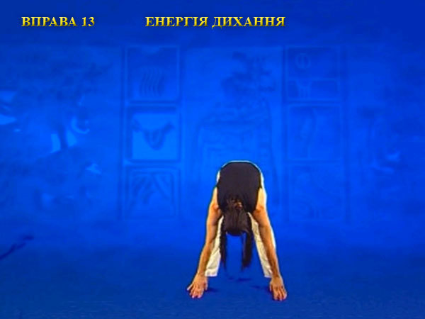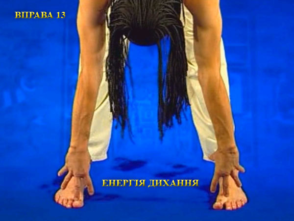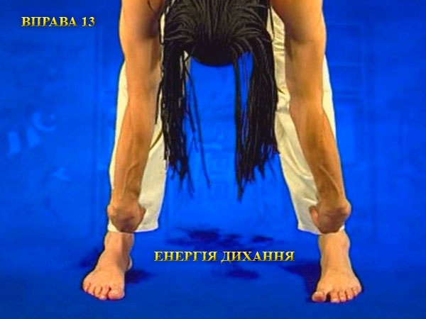 Після закінчення видиху, розправте ноги і вільно зігніться вниз, діставши пальцями рук пальців ніг. Сформуйте пальці у вигляді жмені і зігніть кисті до напруги в зап’ястях. На вдиху, не згинаючи коліна, почніть розпрямлятися. При цьому кисті рук повинні ковзати по передній поверхні тіла.