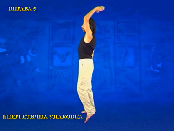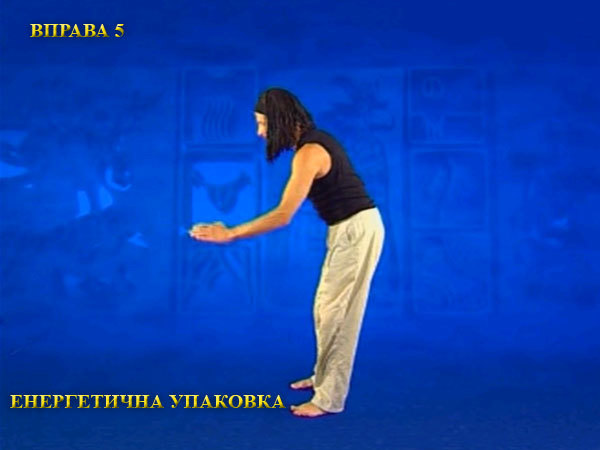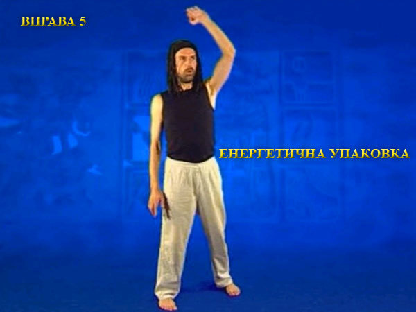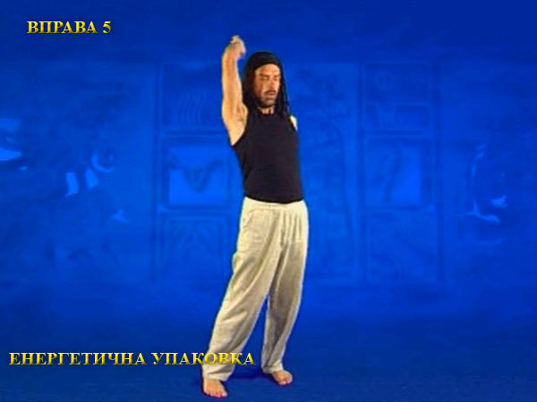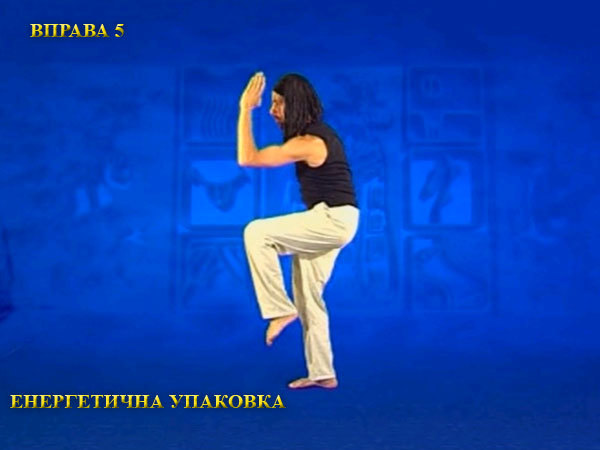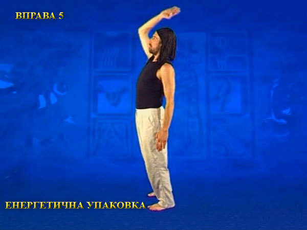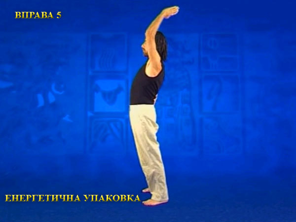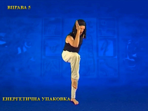 Мислено розділіть все тіло на праву і ліву частині. Змістіть вагу на праву ногу, розігніться в попереку. Лікоть зігнутої лівої руки підіймається вгору за рахунок руху тіла. Утримуючи відчуття розтягування, починайте зводити лівий лікоть і коліно, поступово збільшуючи тиск в області селезінки і підшлункової залози. Пальці лівої ноги пнутися вниз, долоня – вертикальна. Потім розігніться, при цьому ліва рука підіймається вгору, скиньте напругу і не зупиняючись, повторіть те ж саме для правої сторони, збільшуючи тиск і створюючи щільну енергетичну упаковку в області печінки.