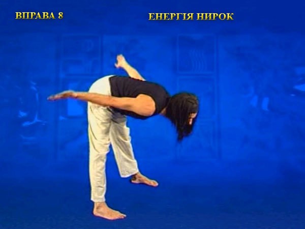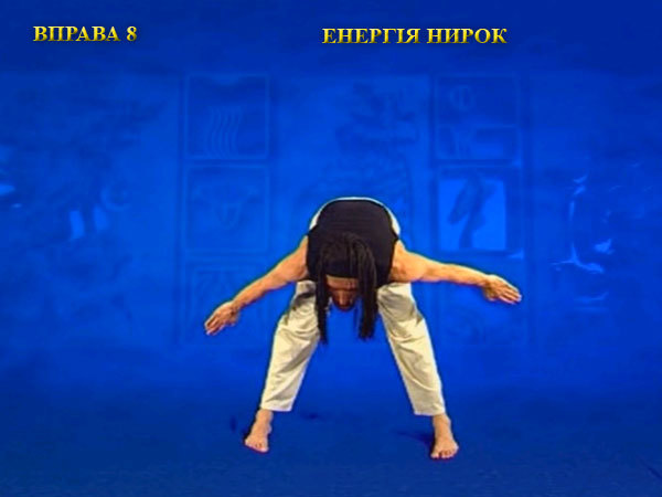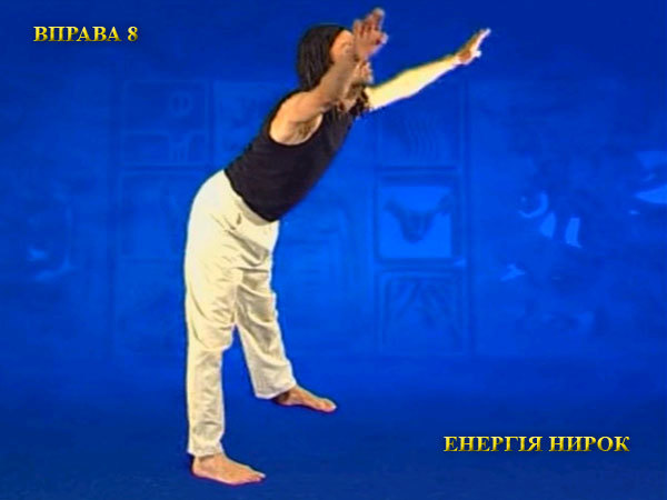 Не зупиняючись, плавно перейдіть до другої частини вправи, коли руки викреслюють кут вершиною вперед. Передня поверхня тіла і руки максимально розтягуються, коли пальці тягнуться назад і в сторони, а підборіддя вперед. При цьому на забувайте розслабляти всі напружені ділянки тіла.