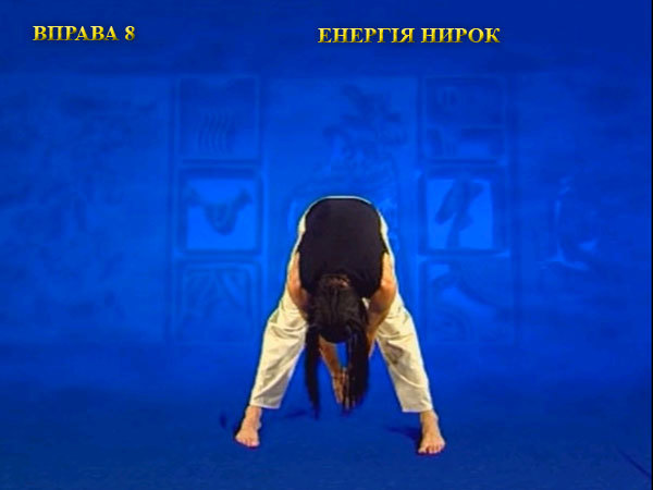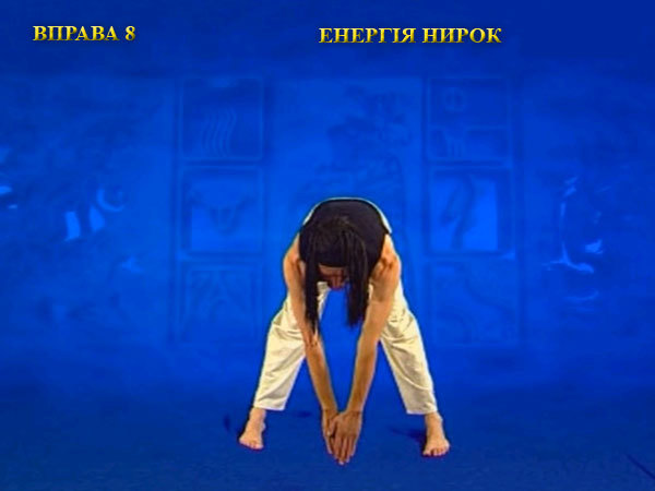 Розпряміть коліна і поставте ноги трохи більше ширини плечей. Нахиліть корпус вперед, а центр ваги змістіть назад. При цьому руки відведіть ближче до ніг і покладіть ліву кисть на праву.
