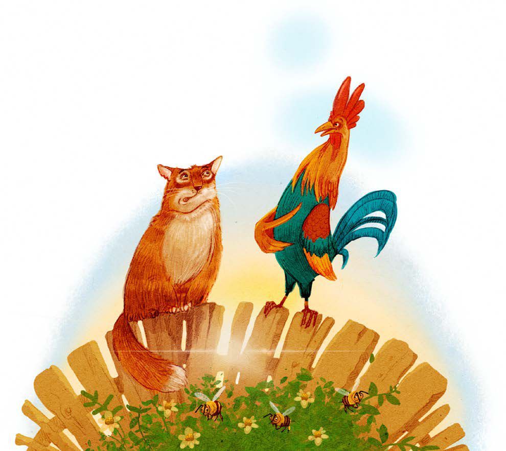 «— Це я розумію, — кіт схилив набік голову. — Але хіба ви не чули про будильник? — Про що? — перепитав Жан. — Будильник. То такий спеціальний пристрій, щоб будити всякого, коли кому треба, — пояснив кіт. — Тепер навіть у кожному телефоні є такий будильник. Можна завести його на будь-який час. — І що, геть в усіх-усіх є такі будильники? — розгубився Жан. — Навіть у нас в селі? — Ну звичайно, — сказав кіт, — ми ж не в доісторичні часи живемо. У всіх є в телефоні будильник. На півня було шкода дивитися. — То що… — сумно спитав він, — я більше й не потрібен? Коту стало трошки ніяково, й він вирішив розрадити Жана хоч чимось: — Не кажіть так, — промовив він до півня. — Я особисто думаю, що ви дуже корисний птах. — Невже? — похмуро спитав Жан. — Саме так! По-перше, ви дуже потрібні вашим курям! Ким ще вони будуть так захоплюватися, якщо вас не буде? — Ну, — Жан трохи подумав, — напевно, ви маєте рацію. Кури — вони такі, їх пильнувати треба. Кожного разу намагаються якусь дурню утнути. Хтось має ж ними керувати. — Повністю з вами згоден! — підхопив кіт. — По-друге, без вас курчат нізащо не буде. Це я по телевізору бачив!».