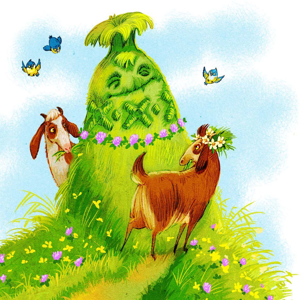 Або історія про той самий пагорб разом із козою Валькірією із назви цієї книжки. «Не гаючи часу, поки пагорб не передумав, обидві кози заходилися обережно обгризати траву на вказаних місцях. А Валькірія навіть вигризла пагорбу на боках візерунок «вишиванка». Коли справу було зроблено, пагорб швиденько збігав до річки, щоб помилуватися на нову зачіску. Результат йому страшенно сподобався. – Я тепер наймодніший пагорб на всю округу! А чи робитимете ви мені зачіски й надалі, коли трава знову відросте? – Із задоволенням! – обидві кози одночасно облизнулися. Пагорб зрадів і побіг хизуватися новою зачіскою перед іншими пагорбами. Ромашка і Валькірія довго дивилися йому вслід. Потім Ромашка спитала у Вальки: – А ти мене навчиш «вишиванку» вигризати? – Чому б ні? Навчу. «Хоч би трава на ньому швидше відростала, бо вельми смачна!» – подумали обидві кози й пішли собі пастися далі».