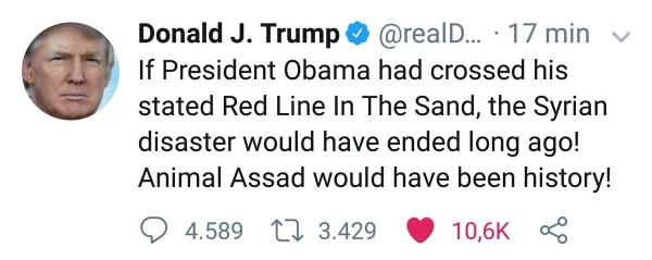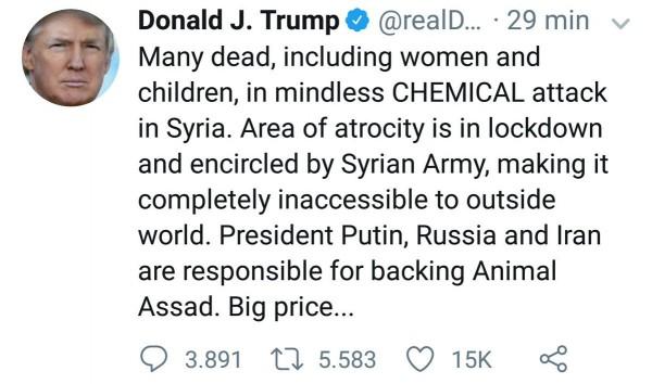 «У хемічній атаці в Сирії загинули багато жінок і діти. Область зараження оточена сирійською армією, що робить її повністю недоступною для зовнішнього світу. Президент Путін, Росія і Іран відповідальні за підтримку цієї тварини – Асада» – Дональд Трамп