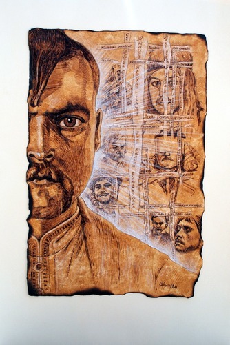 Обкладинка тексту - картина Олени Косінської "Стежками Миколайчука", 2011, туш/перо, пастельний олівець, 60 х 40 см