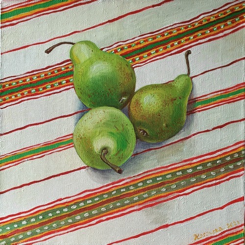 8. "Рябі грушки", 2021, дерево (ящик від боєприпасів)/олія, 104 х 49 см